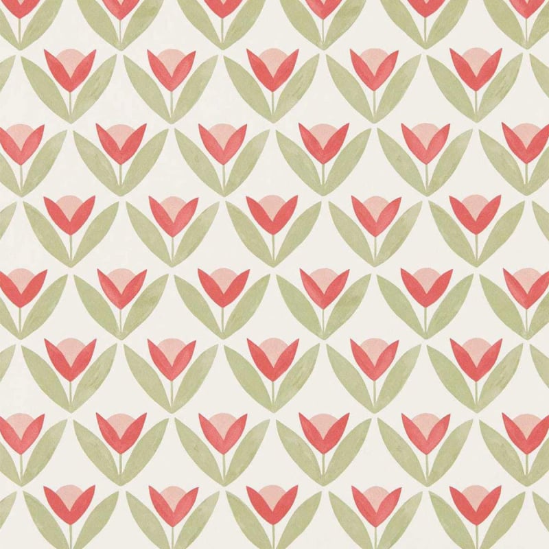 Die Tapete Tulip Trellis entfaltet eine florale Partitur, in der jede Tulpe im Rhythmus einer wohlgeordneten Geometrie zu erblühen scheint. Die Blumen sind präzise ausgerichtet und erheben sich zwischen zwei Blättern, wodurch ein strukturiertes, sich wiederholendes Muster entsteht. Das Design nimmt einen naiven Stil an, mit einem leicht aquarellierten Effekt, der die Komposition weich macht. Diese Wanddekoration von Scion zeichnet sich durch die beherrschte Schlichtheit ihrer Formen aus.