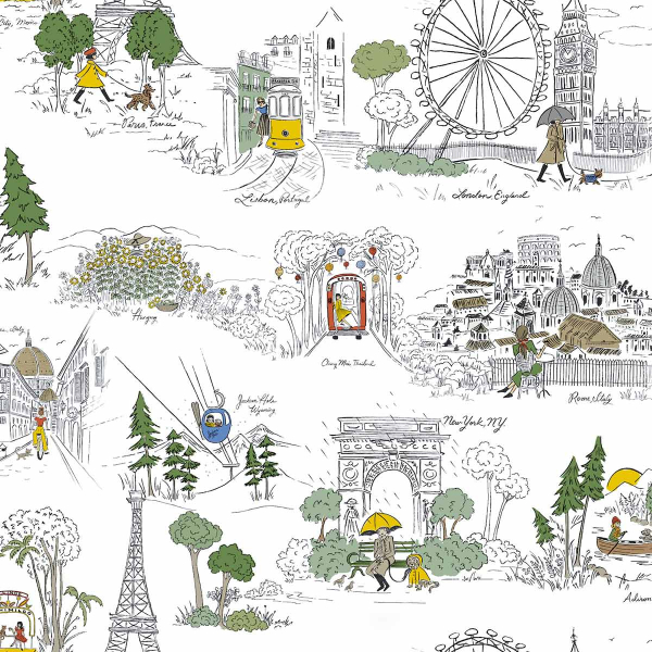 Die selbstklebende Tapete Travel Sketches bietet ein illustratives Reisenmotiv. Emblematische Denkmäler, Stadtlandschaften und Naturszenen folgen in einer lebendigen Komposition aufeinander. Menschen und Tiere bewegen sich leichtfüßig, wie aus einem Logbuch. Jede Szene, inspiriert von den Skizzen von Anna Bond, Künstlerin und Gründerin von Rifle Paper Co., erinnert an eine Etappe einer imaginären Reiseroute.