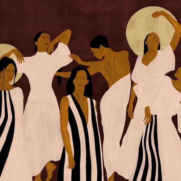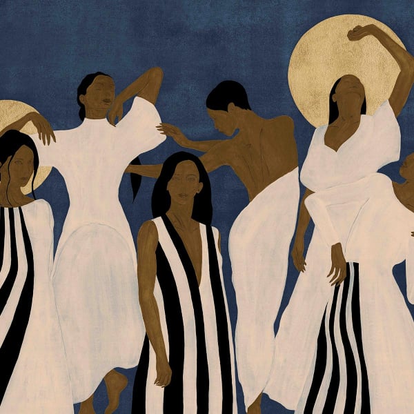 Der Tanz zelebriert die Schönheit der Bewegung durch eine Komposition stilisierter Frauenfiguren. Die schlanken Silhouetten bewegen sich vor einem von zwei Sternen beleuchteten Himmel, zwischen schwebenden Gesten und gestreiften Kleidern. Diese Panoramatapete von Etoffe.com x Bleu Cobalt erinnert an eine stille, von Leichtigkeit geprägte Choreografie. Diese originalgetreu auf hochwertigem Vliesmaterial wiedergegebene Panoramaillustration schafft eine sensible und poetische Atmosphäre.