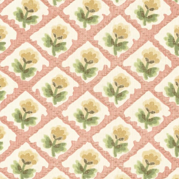 Ein geometrisches Blumenmuster durchzieht die von GP & J Baker herausgegebene Tapete Penny. Rauten umrahmen stilisierte, sanft gemalte Blumen und bilden ein zartes Schachbrettmuster. Die subtile Textur des Hintergrunds verleiht dem Ganzen Tiefe und Charakter. GP & J Baker erforscht hier eine raffinierte dekorative Ästhetik, bei der die Wiederholung meditativ wird.