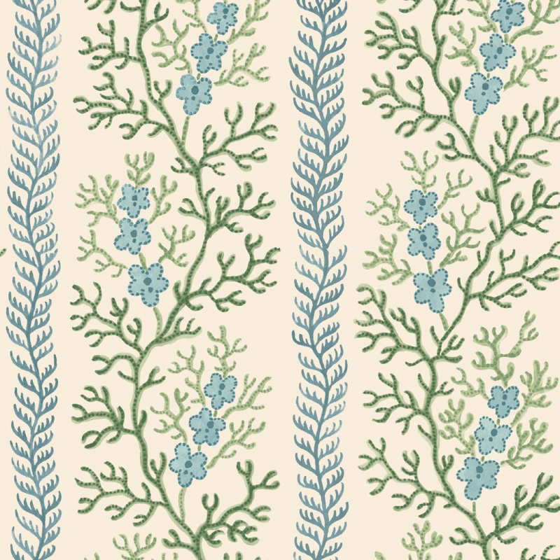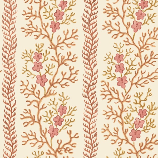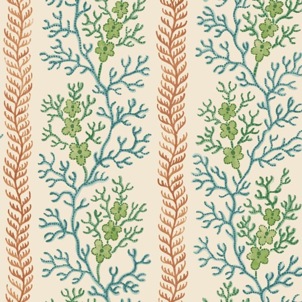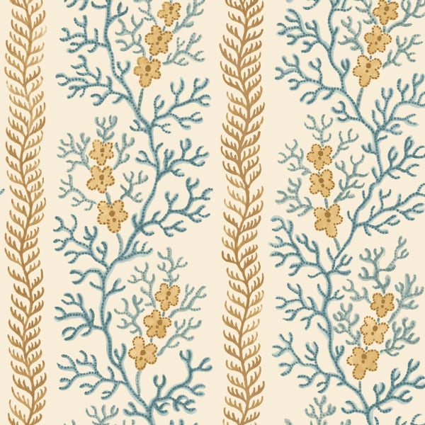 Blattreiche und blühende Zweige erheben sich in anmutigen Säulen auf der Tapete Symington von GP & J Baker. Die Zweige mit maritimen Anklängen entfalten sich mit Finesse und bilden ein geripptes botanisches Muster. Das Ganze erinnert an eine organische Natur auf einem hellen Hintergrund, der die Formen atmen lässt. Die regelmäßige Anordnung erzeugt einen pflanzlichen Streifeneffekt, der sowohl rhythmisch als auch poetisch ist.