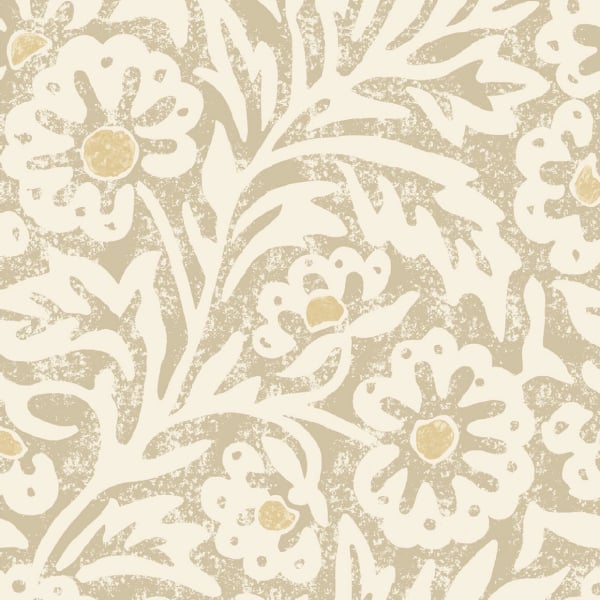 Ein stilisiertes Blumenmuster, inspiriert von einer Schablonentechnik, erstreckt sich über die Tapete Flower Patch. Große, abgerundete Blütenblätter entfalten sich in einer bewusst unregelmäßigen Komposition zwischen dichtem Laub. Die Formen verlaufen über einen strukturierten Hintergrund mit Retro-Charme. Diese von GP & J Baker signierte Tapete drückt eine alte ornamentale Sprache aus, die sowohl roh als auch zart ist.
