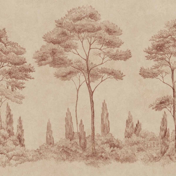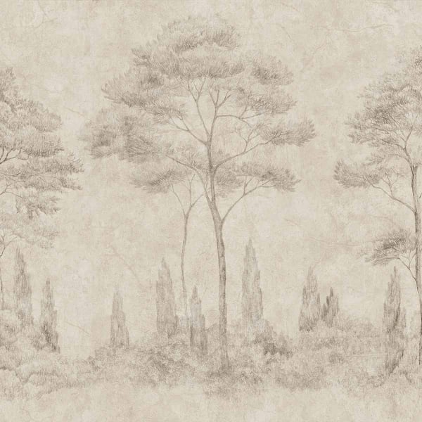 Ein illustratives botanisches Motiv durchzieht die von Sandberg herausgegebene Panoramatapete Andrea. Es zeigt eine Landschaft mit Nadelbäumen und Zypressen, typisch für mediterrane Wälder. Wie eine Bleistiftzeichnung enthüllt die klare und nuancierte Linie die Details einer schlanken und beruhigenden Vegetation. Diese Landschaft lädt zur Betrachtung in einer weiten und ausgewogenen Komposition ein.