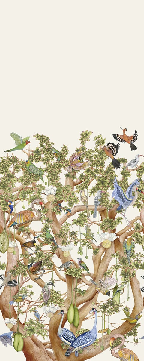 Die Panoramatapete Tree of Life zelebriert eine imaginäre Welt, in der die Natur blüht. Sein Pflanzen- und Tiermotiv entlehnt sich der Finesse orientalischer Miniaturen mit einem dichten und lebendigen Design. Cole and Son komponiert eine Landschaft, die aus einem stilisierten Baum besteht, der seltene Vögel, Laub und Blumen mit großzügigen Formen beherbergt. Das Ganze erinnert mit seinem malerischen Erscheinungsbild an einen traumhaften Wandteppich mit fernen Einflüssen.