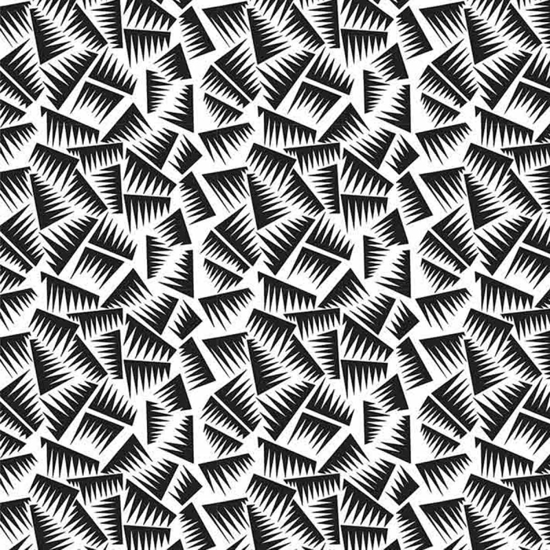 Jer ist eine von LCE herausgegebene grafische Tapete, inspiriert von einer Zeichnung aus den 1920er Jahren während der Art-Deco-Periode. Sein dynamisches Motiv stellt dreieckige Formen nebeneinander, die mit regelmäßigen Spitzen besetzt sind, die in alle Richtungen ausgerichtet sind. Diese Komposition erinnert an eine moderne und lebendige Stilisierung. Das Ganze erzeugt einen dichten visuellen Rhythmus, der durch den Kontrast zwischen hellen Figuren und dunklem Hintergrund unterstrichen wird.