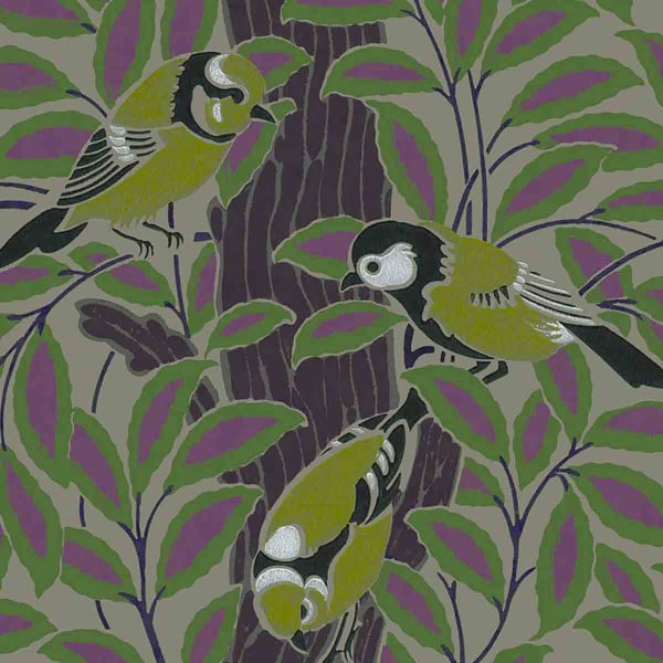 Le Chant des oiseaux zeigt Meisen, die inmitten eines üppigen Laubwerks sitzen. Diese Tapete von Isidore Leroy basiert auf einer von Hand neu interpretierten Zeichnung. Das Motiv wechselt klare Linien und Flächen in einer rhythmischen und grafischen Komposition ab. Die Natur wird zum Dekor, zwischen Tierpoesie und ornamentaler Stilisierung.