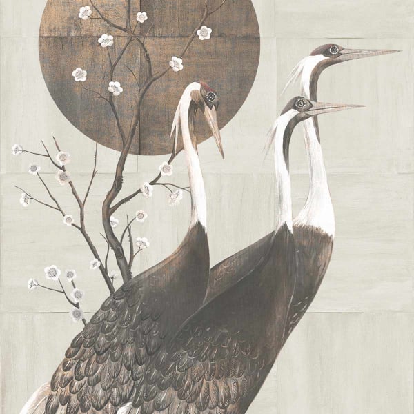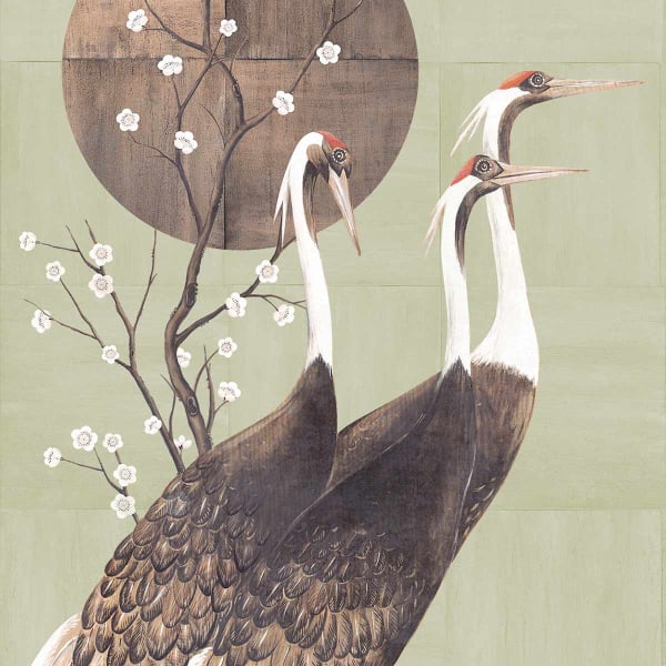 Die Tapete Tsuro offenbart ein von Japan inspiriertes Panoramafresko, in dem sich lange Kraniche zwischen zarten Zweigen aufhalten. Die Vögel setzen sich auf eine Oberfläche, die von strukturierten Quadraten mit einer weichen und leicht unregelmäßigen Linienführung durchzogen ist. Das poetische Design fügt sich in dieses Muster ein, das reich an Nuancen und Ausgewogenheit ist. Diese raffinierte Interpretation von Masureel öffnet eine Tür zu einer heiteren Atmosphäre.