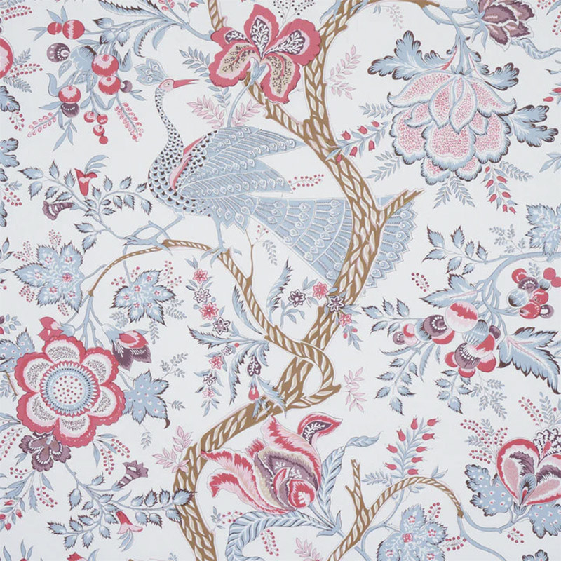 Die Tapete Aveline von Schumacher zeigt einen schlanken Pfau im Herzen einer gewundenen und üppigen Vegetation. Die stilisierten Blumen, die Zierfrüchte und das entfaltete Laub bilden ein detailreiches Fresko. Inspiriert von indischen Textilien des 19. Jahrhunderts, verbindet das Design pflanzliche Fantasie und grafische Präzision. Diese Wandverkleidung erinnert an eine üppige und raffinierte Welt.