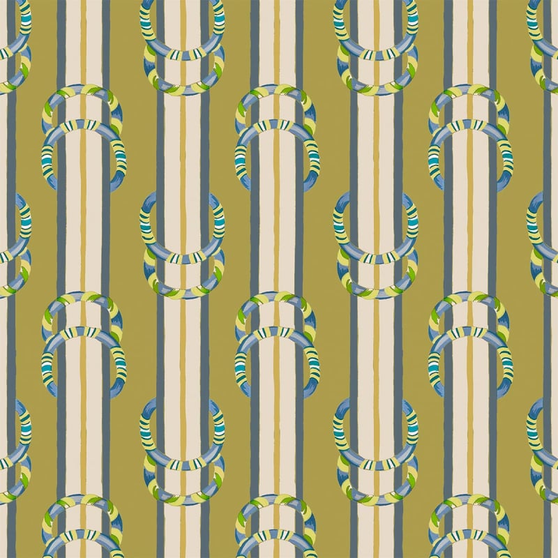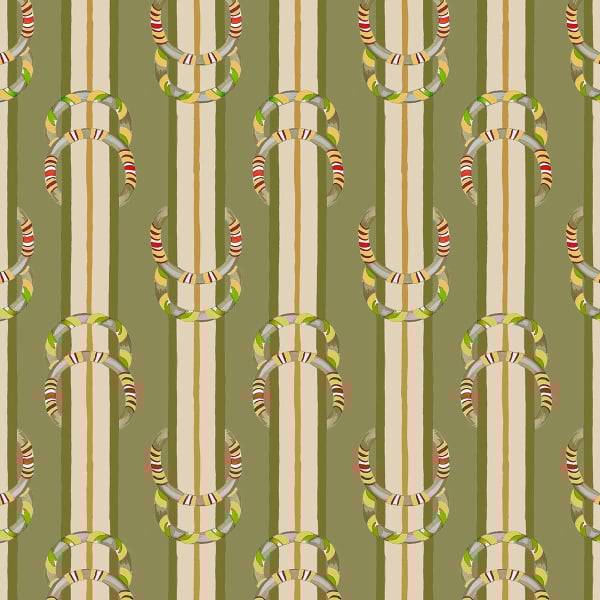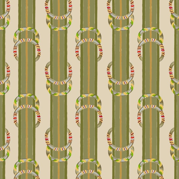 Little Cabari feiert die Reitkunst mit der Tapete Gaucho. Der vertikale Streifen setzt sich mit Geschmeidigkeit durch, rhythmisiert von geometrischen Verflechtungen, die von traditionellen argentinischen Gurten inspiriert sind. Das dichte und sich wiederholende Muster bildet einen strukturierten Rahmen von schöner Modernität. Jeder Streifen vibriert mit einem sublimierten handwerklichen Erbe, zwischen geflochtener Strenge und textiler Erinnerung.