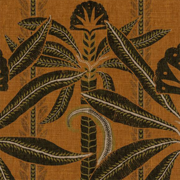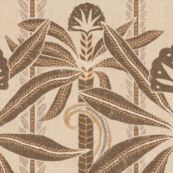 Mit der Tapete „Kerala“ erinnert Arte an die sanft wiegenden Palmen, die die Küsten Südindiens säumen. Die großen, gewundenen Blätter bilden ein stilisiertes Muster, das von kontrastierenden Adern durchzogen ist. Das Pflanzenmotiv hebt sich von einem leinenähnlichen Hintergrund mit einer lebendigen, lockeren Webart ab. Jedes Detail zelebriert eine Natur, die sowohl dicht als auch luftig ist.