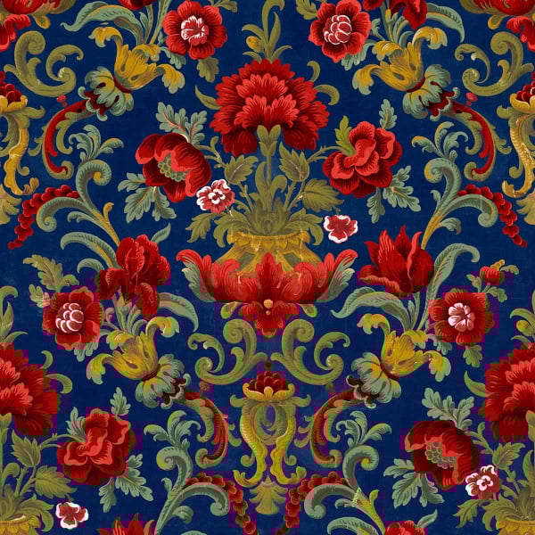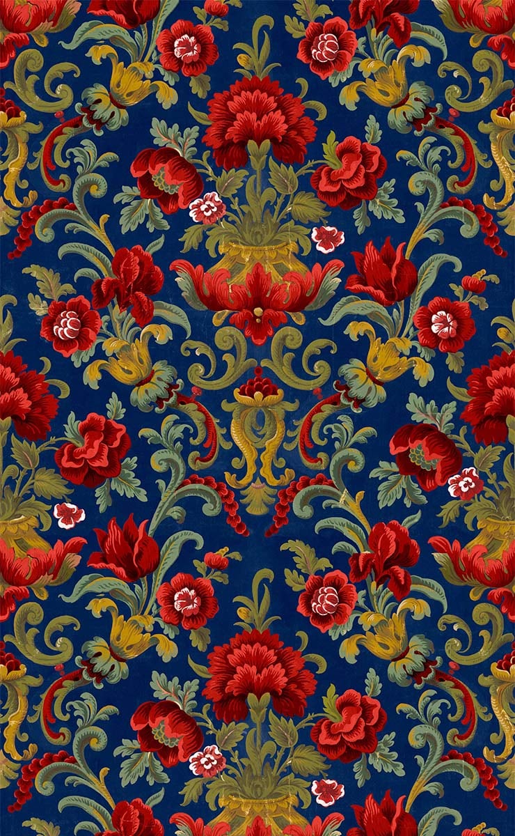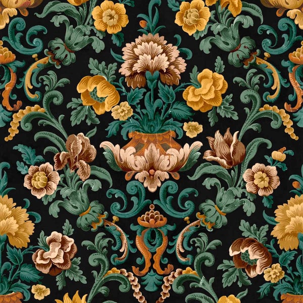 Die Tapete Aranjuez Damask zeigt ein damastartiges Blumenmuster, das durch eine symmetrische Komposition mit einer Vase in der Mitte strukturiert ist. Stilisierte Pfingstrosen und Tulpen entfalten sich in voller Pracht, umgeben von Ranken, die sich zu geschmeidigen Arabesken winden. Diese von Coordonné signierte Komposition ordnet Palmetten und Blattwerk in einem präzisen Geflecht an, das die Oberfläche belebt.