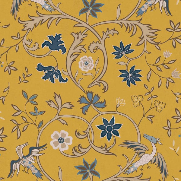 Die Tapete Antwerp Damask von Coordonné zeigt ein von alten Damaststoffen inspiriertes Blumenmuster. Große, wellenförmige Ranken zeichnen eine Pflanzenarchitektur, in der zarte Blütenkränze, Palmette und fein geschnittenes Laub erblühen, unterbrochen von Vögeln mit ausgebreiteten Flügeln. Das Ganze offenbart eine meisterhafte Harmonie, die durch ineinander verschlungene Arabesken belebt wird, die der Komposition auf geschmeidige Weise Rhythmus verleihen.