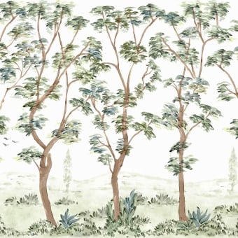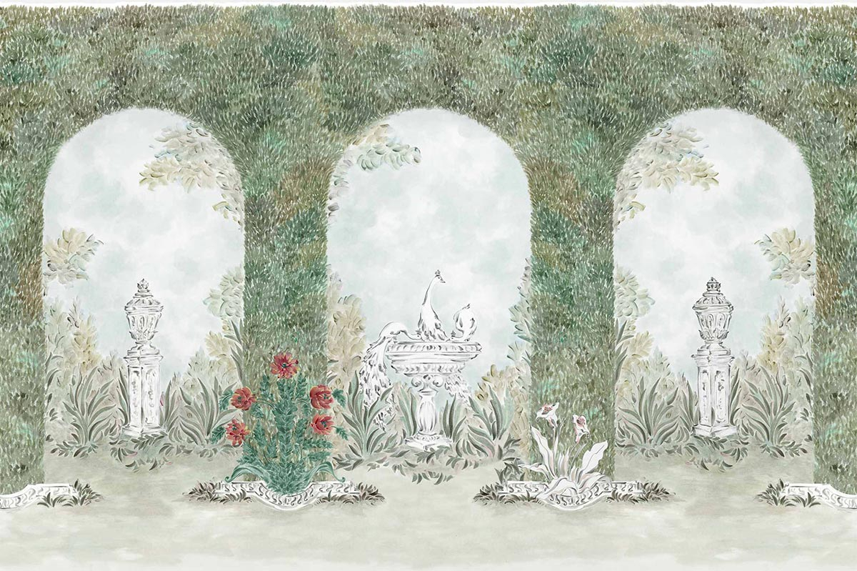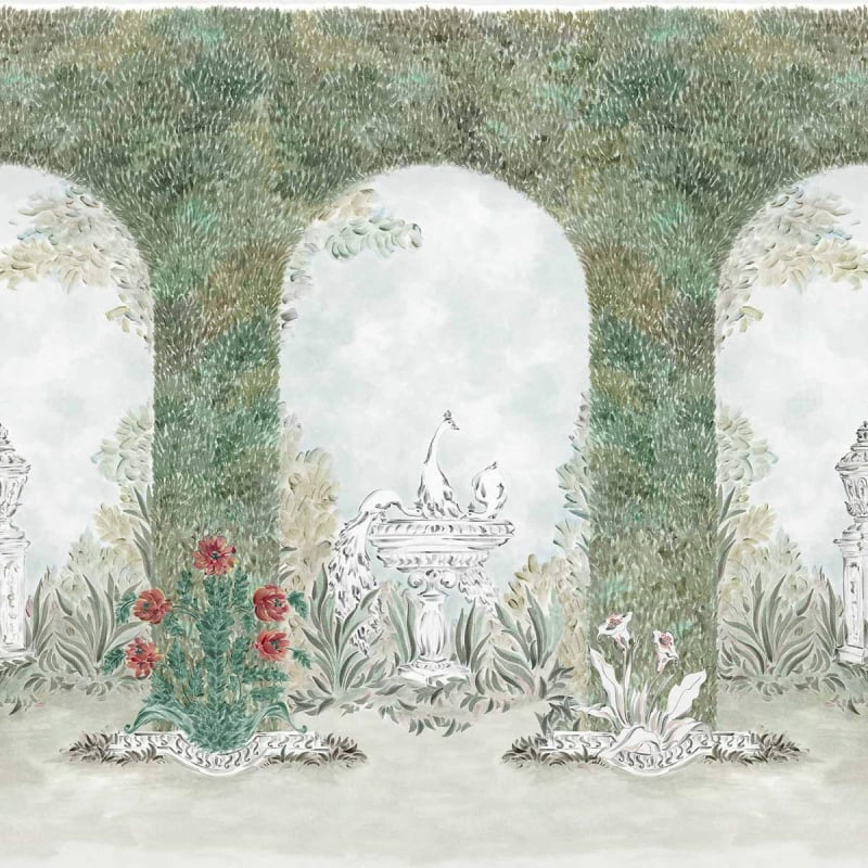 Coordonné präsentiert die Panoramatapete Alcazar, eine architektonische Komposition, in der pflanzliche Arkaden die Szene bestimmen. Unter diesen Gewölben aus dichtem Laub befinden sich Zierbauten, gemeißelte Becken und schlanke Urnen inmitten einer frei skizzierten Flora. Das Motiv erinnert an einen klassisch inspirierten Garten, der durch einen zentralen Brunnen belebt wird, an dem sich Vögel ausruhen.