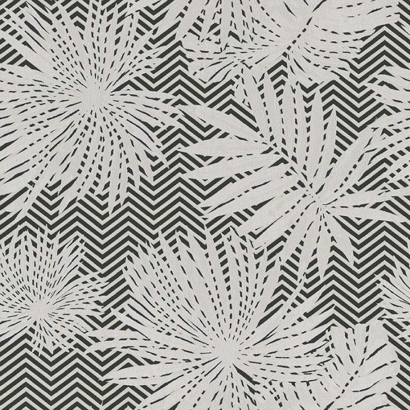 Missoni Home präsentiert die Tapete Ombre, bei der sich das Pflanzenmotiv mit einem markanten geometrischen Muster verbindet. Große Farnblätter strahlen fächerförmig auseinander, wobei ihre fein gerippten Adern eine organische Bewegung entfalten. Im Hintergrund strukturiert ein Fischgrätenmuster die Oberfläche und erzeugt eine grafische Pulsation. Das Ganze bildet einen rhythmischen Dialog zwischen klaren Linien und botanischen Formen.