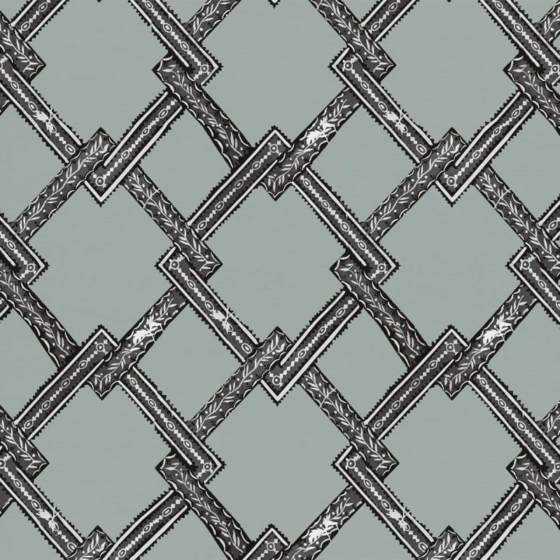 Le Grand Siècle präsentiert Ermitage, eine Tapete mit einem geometrischen Muster, das durch stilisierte, sich präzise kreuzende Gitterstrukturen strukturiert wird. Die architektonisch gestalteten Linien skizzieren ein Netz aus ineinandergreifenden Rahmen, die von fein gearbeiteten dekorativen Details durchzogen sind. Die klare, rhythmische Linienführung unterstreicht eine von klassischen Repertoiren inspirierte ornamentale Schrift. Das Ganze schafft eine geordnete Fläche, auf der die Strenge des Musters den Raum strukturiert.