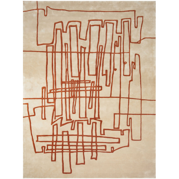 Ein abstraktes geometrisches Muster durchzieht den von Lelièvre Paris entworfenen Teppich Fil. Ein Netz aus geformten Linien bildet ein labyrinthartiges Muster auf einem einfarbigen Hintergrund. Das Reliefmuster schneidet die Oberfläche präzise ab und bringt architektonische Dynamik. Dieses handgeknüpfte Modell aus reiner Wolle kombiniert die Strenge der Linie mit der Weichheit der Faser.
