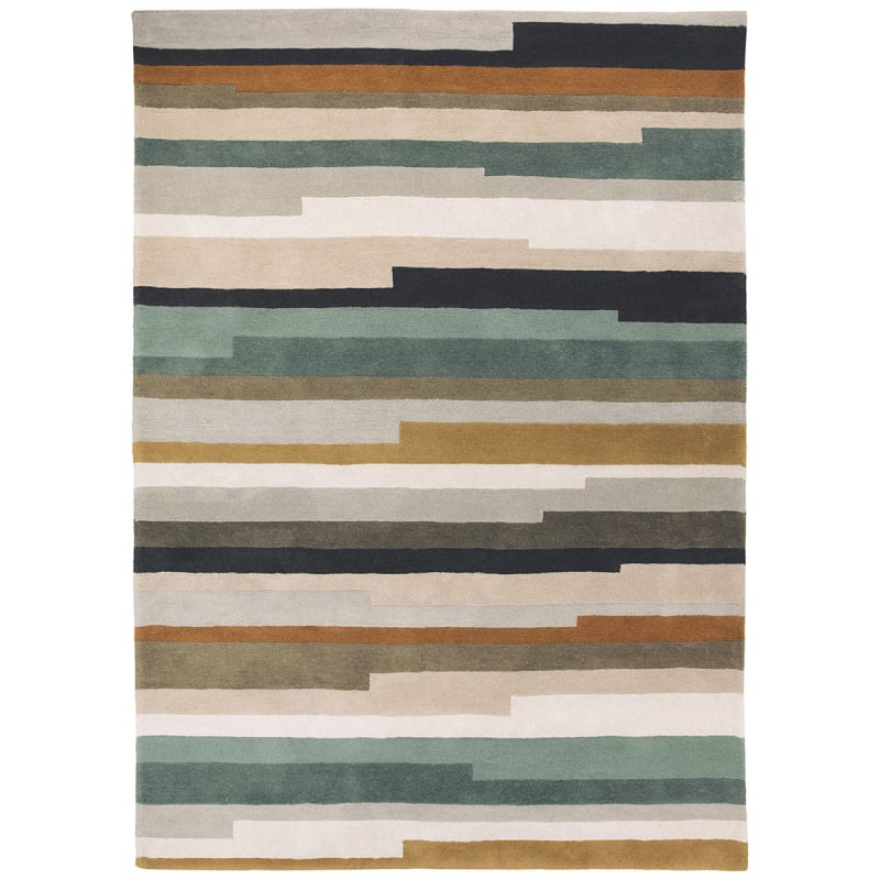 Der von Romo herausgegebene Teppich Clarice überrascht mit einem geometrischen Muster, das aus zeitgenössischen gebrochenen Streifen besteht. Die horizontalen Streifen, die in unregelmäßige Schichten unterteilt sind, sind in einem kontrollierten visuellen Rhythmus angeordnet. Die Oberfläche aus natürlicher Wolle offenbart eine dichte Textur, die von grafischen Brüchen durchzogen ist. Dieses Stück, das mit der Technik des manuellen Tuftings hergestellt wird, erforscht das Gleichgewicht zwischen Linearität und Fragmentierung.