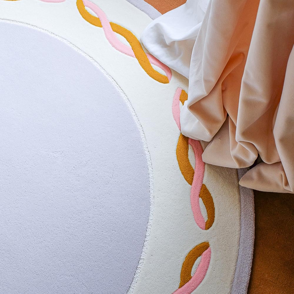 Swing entfaltet ein kreisförmiges Ziermotiv mit einer raffinierten Struktur. In seiner Mitte zieht ein schlichtes Medaillon die Blicke auf sich. Und um ihn herum zeichnet ein Fries aus verdrehten Bändern einen durchgehenden Kreis am Rand. Diese grafische Komposition basiert auf der kontrollierten Wiederholung, der Weichheit der Kurven und einer symmetrischen Konstruktion. Dieser Teppich von Tapicheri erforscht die Geometrie in einem verspielten Geist, ohne Übermaß.