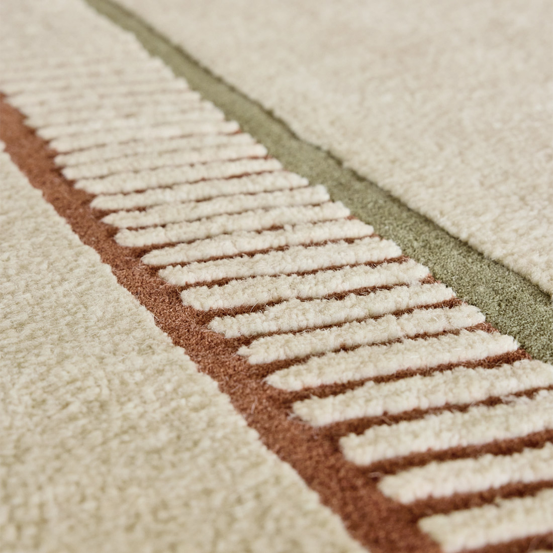 Der Teppich Maps von Serge Lesage entfaltet ein Muster, das durch ein Gewirr von schrägen, dünnen oder dicken Linien strukturiert ist, die sich kreuzen, ohne sich jemals zu überlappen. Einige Bereiche sind mit dichten vertikalen Linien gefüllt, während andere leer bleiben und mit dem Kontrast spielen. Jedes Segment deutet auf eine leicht unterschiedliche Nuance hin, die durch klare Linien begrenzt wird. Die klaren Kanten ohne sichtbaren Rahmen verstärken die Harmonie des Ganzen.
