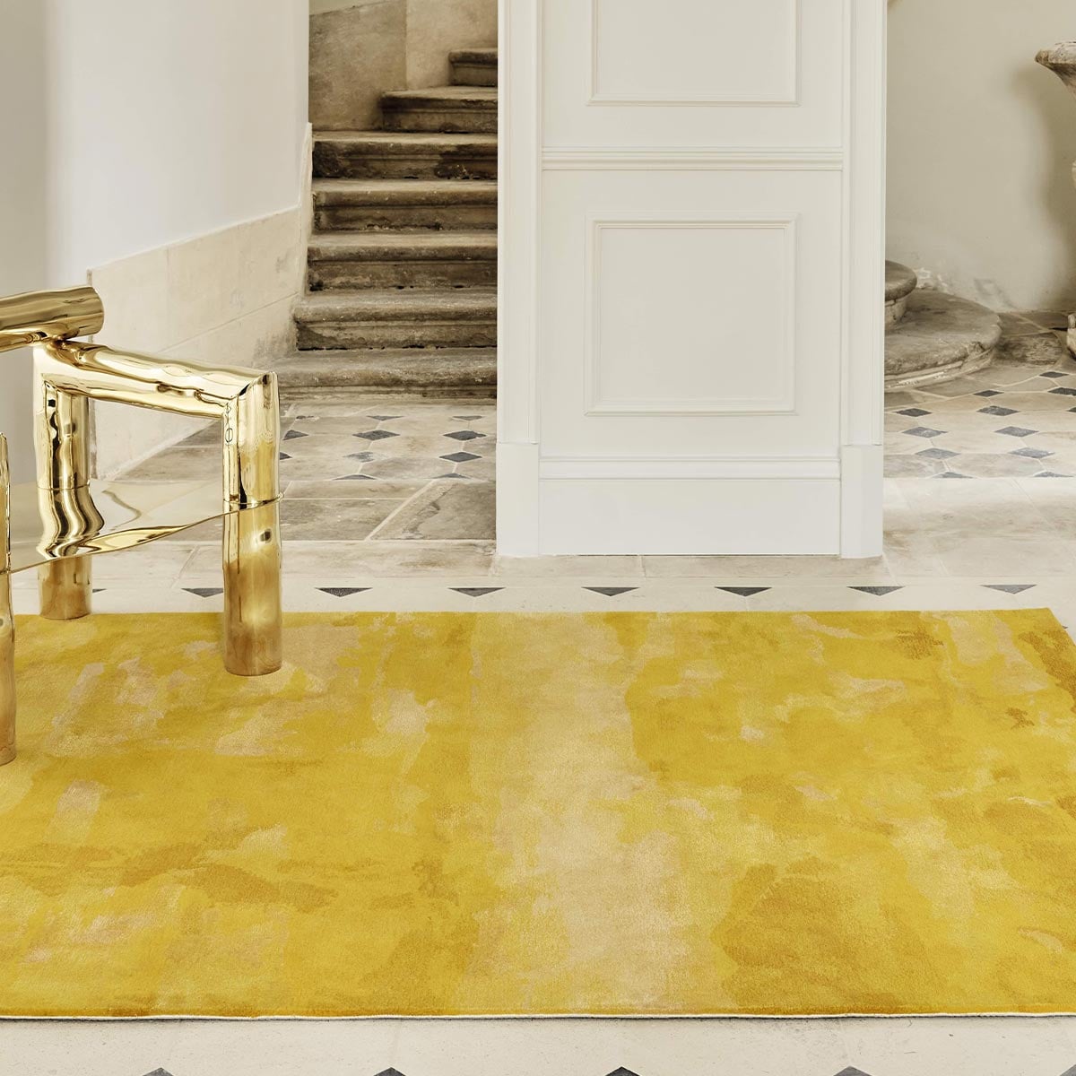 Der Teppich Aurora von Serge Lesage erinnert an eine leuchtende Fläche, die von zarten, von einer Lavierung inspirierten Übergängen durchzogen ist. Die Oberfläche vibriert unter einer präzisen Arbeit von Modulationen, die den Raum ohne Unterbrechung strukturieren. Er ist von Hand getuftet und kombiniert Wolle und Bambusfasern zu einem dichten und geschmeidigen Muster. Das Muster fügt sich mit einer stillen Tiefe in das Material ein.
