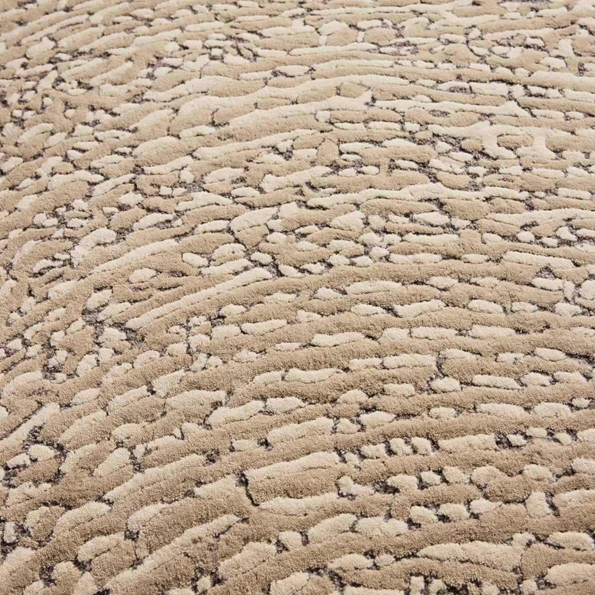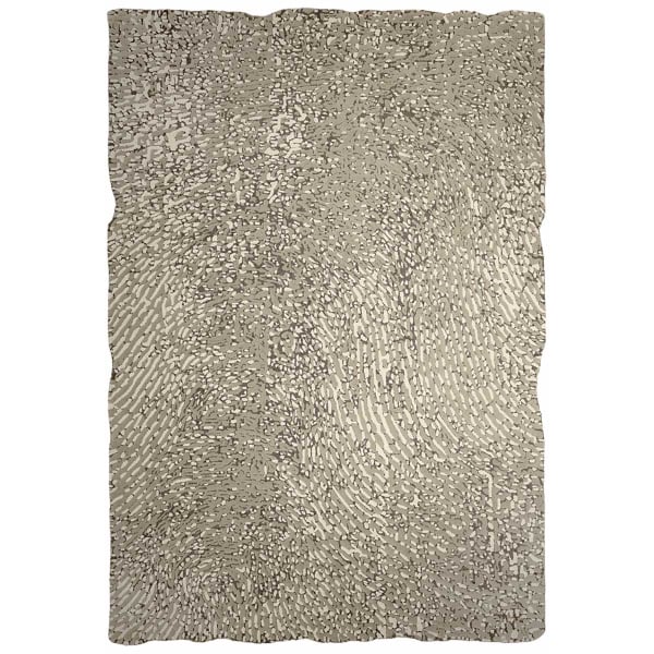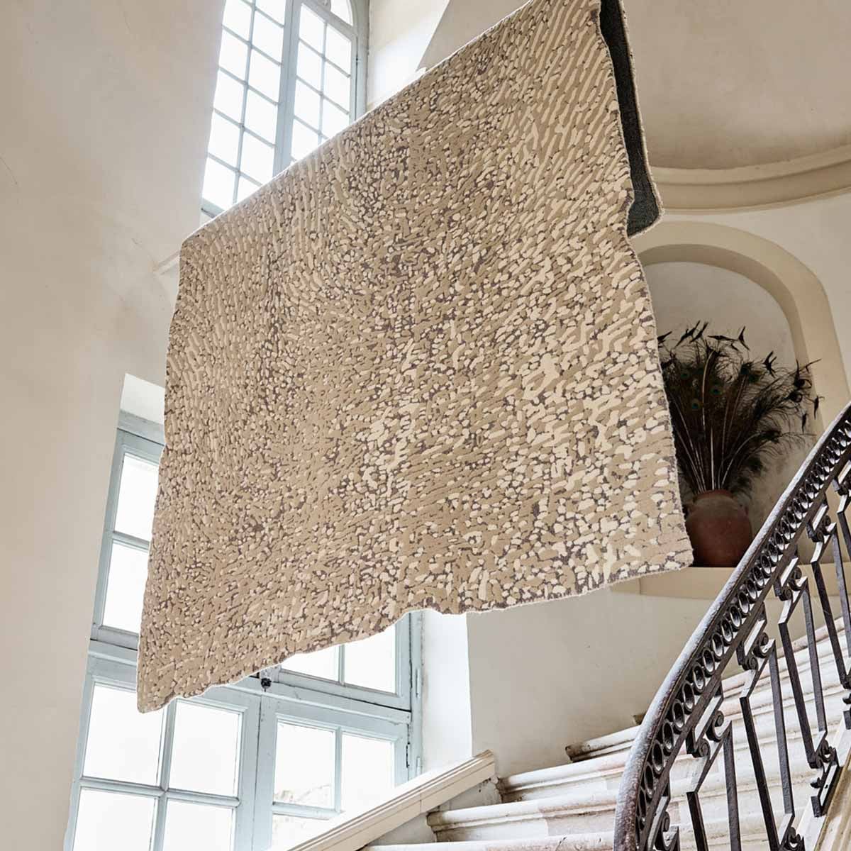 Der Teppich Umbra offenbart ein geometrisches Muster, das wie ein freies Fragment konzipiert ist und in dem sich die Linien in diskontinuierlichen Bewegungen entfalten. Die zufällig geschnittenen Kanten unterstreichen diese formale Freiheit. Die Unregelmäßigkeit verleiht dem Ganzen eine zutiefst künstlerische Dimension. Dieses vollständig von Hand aus Wolle getuftete Dekor von Serge Lesage bringt ein dichtes Material mit feinem Relief zum Ausdruck.