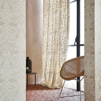 Pure Morris North Fabrics is a collection that gathers together embroideries, prints, and weaves. It is composed of popular archive designs that have been reworked; as an example, the range includes wallpaper patterns that were adapted into textiles. In order to bring the graphics back into fashion, complex embellishments share the spotlight with subtle textures, all recalling the Nordic landscape and way of life. In fact, the models of this selection are largely inspired by the outdoor sceneries described in the diaries of William Morris, written during his 1871 expedition in the North. To give a little something to everyone, vegetal elements are embroidered or stylized with an elegant and authentic style. The colors vary from neutral to aquarelle tones, with a touch of Art Deco from time to time.