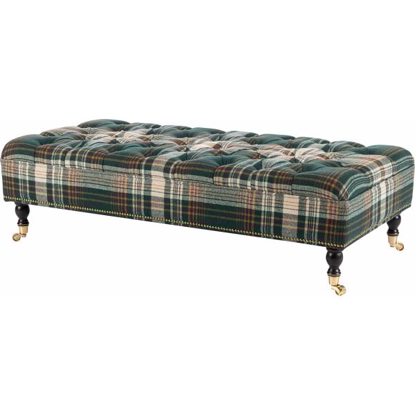 The Monterey Plaid seat has a rectangular silhouette highlighted by a Scottish-style check pattern. This model by Mindthegap reveals a structured grid, printed on natural wool. The upholstered seat rests on wooden feet, with golden wheels and rivets. The bench expresses the attention to detail, combined with the softness of the material.