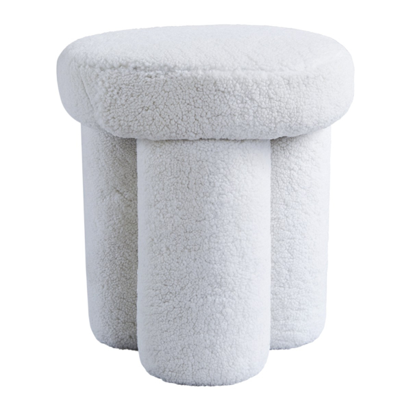 The Big Foot Sheepskin seat unfolds a primitive sculpture, composed of massive feet with rounded contours. Covered with natural sheepskin, this stool with curved volumes expresses a warm and organic presence. The fabric's textured pattern suggests an enveloping tactile experience. Each touch reveals the soft, curly texture of the material, the sensory signature of 101 Copenhagen.