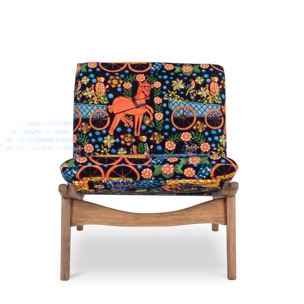 Inspired by the Tyrol festival, the Alyson Fasnacht Anthracite chair displays a dense figurative pattern. Floral carriages and mountain traditions run through the cotton velvet surface. The wooden structure anchors this Mindthegap creation in an aesthetic that is both contemporary and artisanal. Its minimalist design and generously padded cushions provide enveloping comfort.