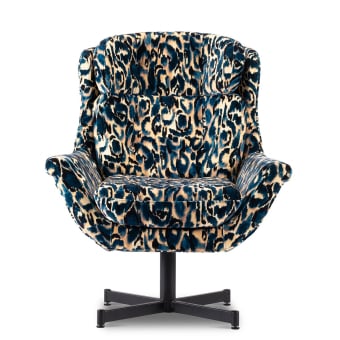 The John Swivel Blu Selvaggio armchair combines a contemporary silhouette with enveloping comfort. Its metal base, composed of branches connected to a central rotating axis, adapts to everyday use. It supports a large cotton velvet cushion, printed with an animal pattern with irregular spots. The set reflects Mindthegap's signature, between the nobility of materials and raw instinct.