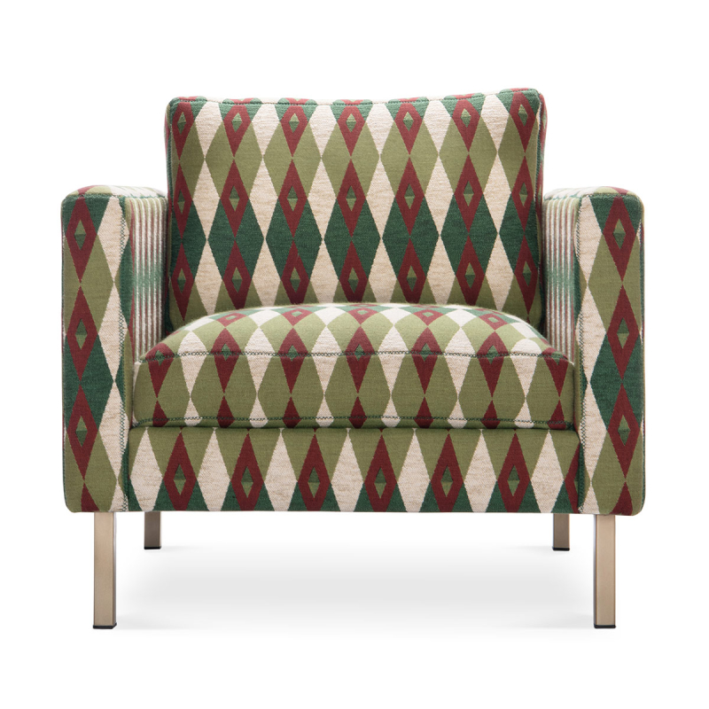 Designed by Mindthegap, the Maverick Clubchair Giardino is distinguished by its wooden structure, supported by slender metal legs. Its geometric pattern, composed of superimposed diamonds, unfolds a hypnotic appearance. A generous seat and a thick cushion reinforce the impression of enveloping comfort. This seat displays a contemporary line, enhanced by the natural elegance of cotton.