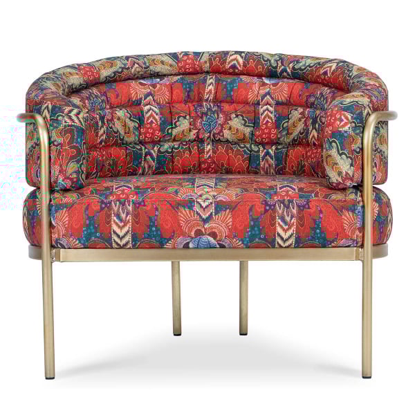 With a theatrical allure, the Peregrine Psychedelia armchair seduces with its curved shapes and padded back. Its ornamental floral motif, inspired by psychedelic aesthetics, consists of plant arabesques and symmetrical figures. The design is printed on natural linen, whose texture enhances the depth of the decor. This model rests on a metal structure that reveals Mindthegap's know-how.