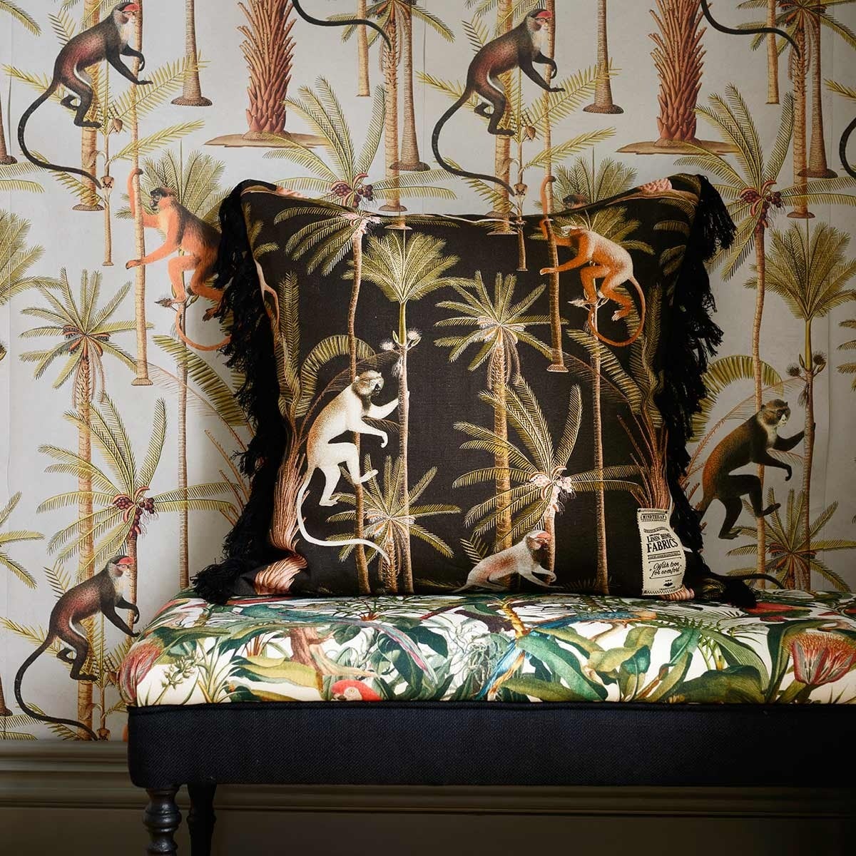 One of the Caribbean islands is lending its name to the Barbados cushion adorned with fringes. Minthegap represents the exotic fauna and flora of the country, with mischievous monkeys that are clinging to palm trees. The set is drawn on a background of solid hue to emphasize its natural and tropical charm.