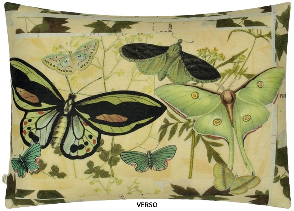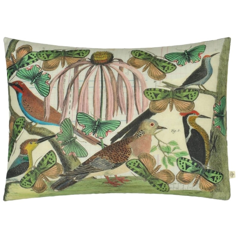 The front of the Floral Aviary cushion displays a collage of birds and butterflies around a flower. Its back has large exotic butterflies in intense and soft colors. Made from a linen blend, this model is pleasant to the touch.
