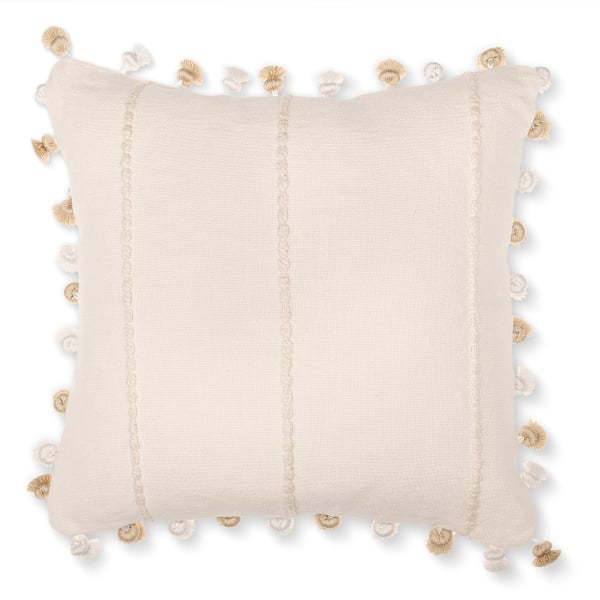 Crafted from a linen and cotton blend fabric, the Milchschaum cushion boasts a clean design and warm coloring. On its delicately textured plain background, thin strips are established in a crochet style. Silky tassels in alternative colors decorate the edges of this square pattern brought to you by Mindthegap.