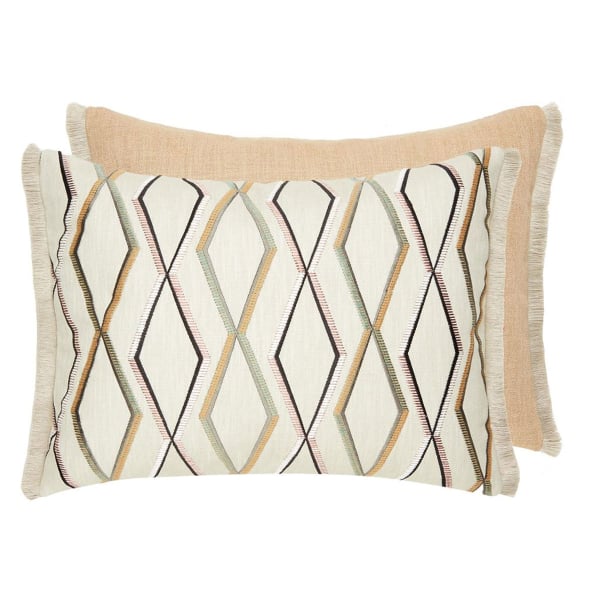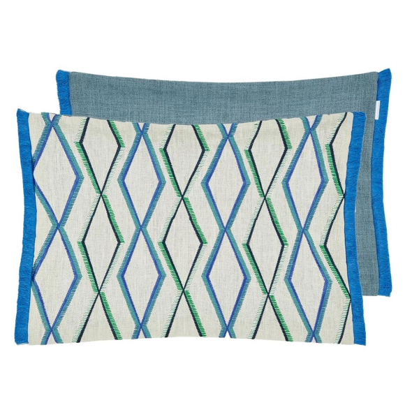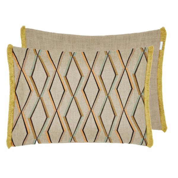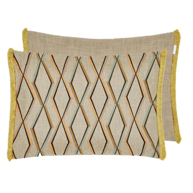 Designers Guild offers Trevenna, a rectangular linen cushion. On its front, a succession of embroidered lines and diamonds compose a geometric pattern. In contrast, its plain back highlights the dense texture and sobriety of the fiber. Featuring moss fringes on two sides, this piece highlights the dialogue between graphic rigor and textile softness.