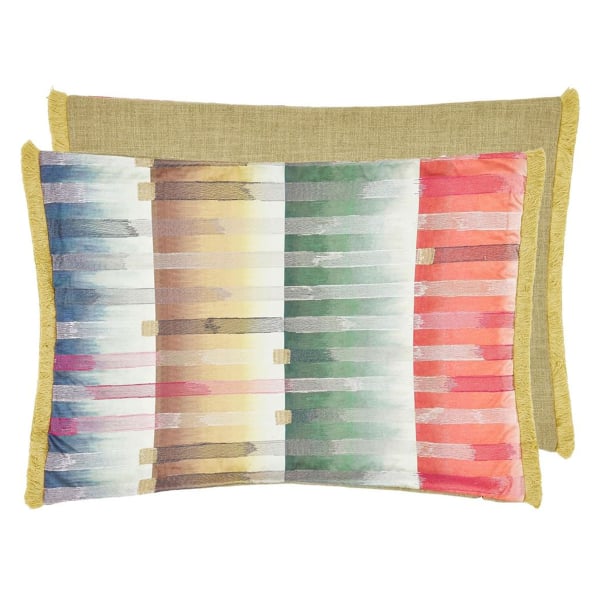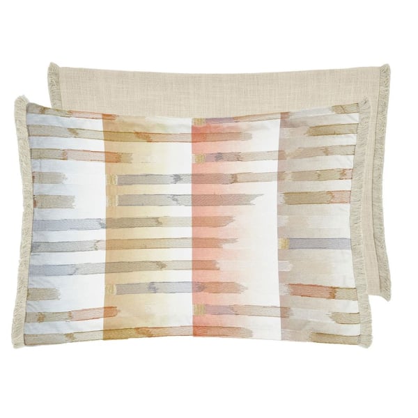 On the front, the Cascata rectangular cushion reveals a rhythmic composition of irregular bands that blend gently. Printed on a cotton satin, the striped pattern is enriched with embroidered lines, punctuated with golden threads. The plain reverse evokes sobriety. Fine fringes adorn both sides of this Designers Guild decor.