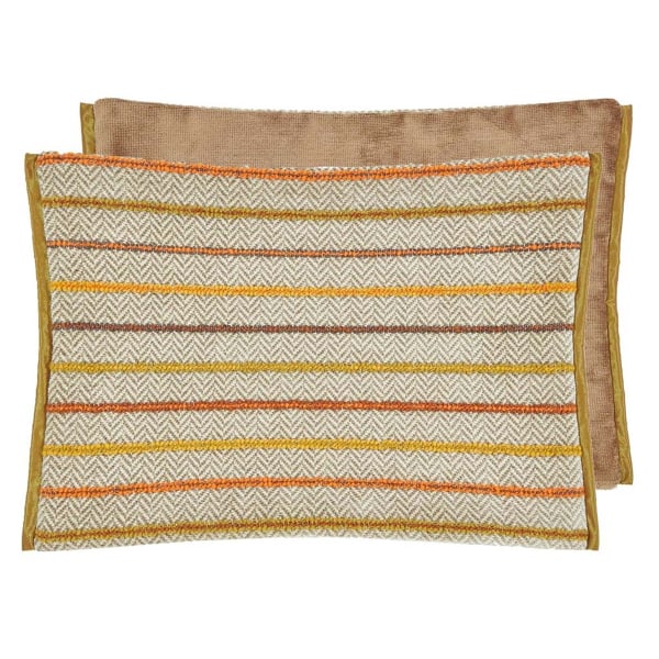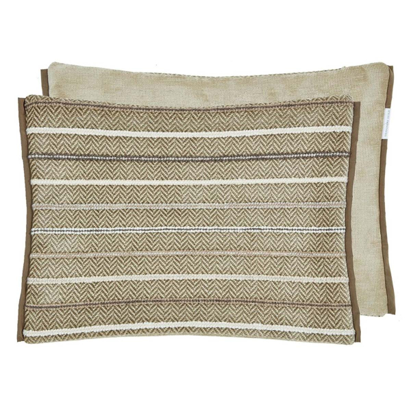 The Porthminster rectangular cushion features a geometric pattern on its front. Regular horizontal lines run through a base with discreet chevrons, created by a precise jacquard weave. Through its plain velvet composition, the reverse of this Designers Guild model forms a contrast of texture. The set is bordered on two sides by a fine border.