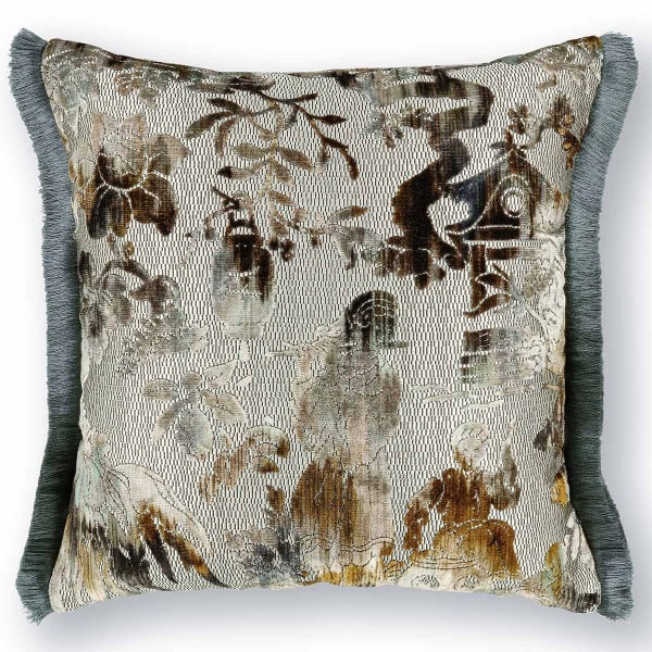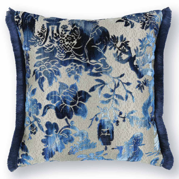 Isenzo is an ornamental square cushion with a figurative chinoiserie motif. Stylized birds and lush vegetation intertwine and run smoothly across the surface. The design unfolds on a jacquard velvet with a dense and nuanced relief. Brushed fringes frame both sides and emphasize the decorative character according to the vision of Black Edition.