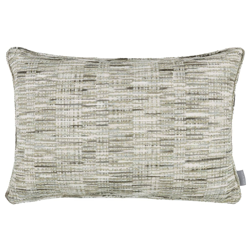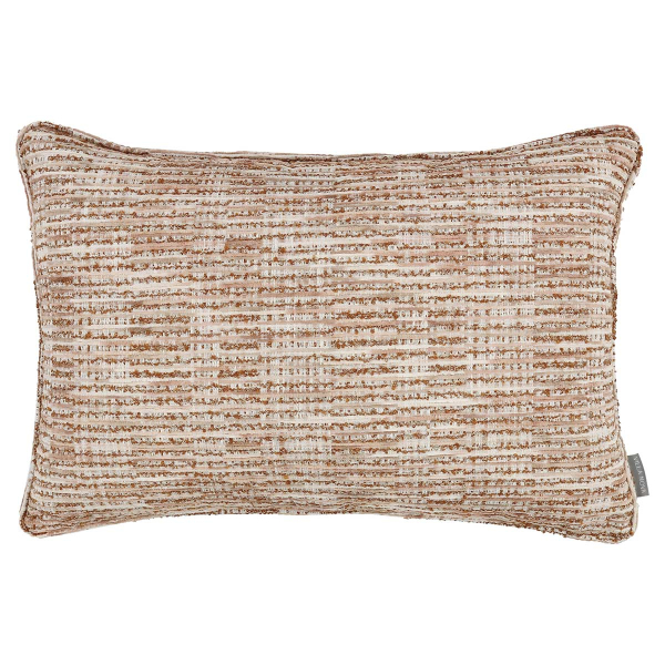 The rectangular Koya cushion features a textured pattern with intersecting lines, evoking the structure of a rustic-style decor. The jacquard weave reveals a dense composition, formed of soft chenille and twisted bouclé. The surface of the design vibrates discreetly, as if animated by a subtle play of reflections. The whole creates a rhythmic depth, between controlled irregularity and textile harmony.