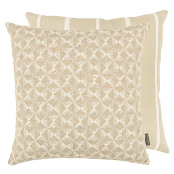 The rectangular Torus cushion features a striped pattern woven into a jacquard structure. Each strip, formed of looped threads, follows a free rhythm and composes a nuanced graphic effect. The surface reveals a fine texture, resulting from a cotton weave. The Villa Nova house designs a sober piece, built around the material and detail.