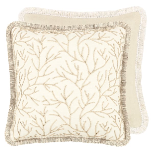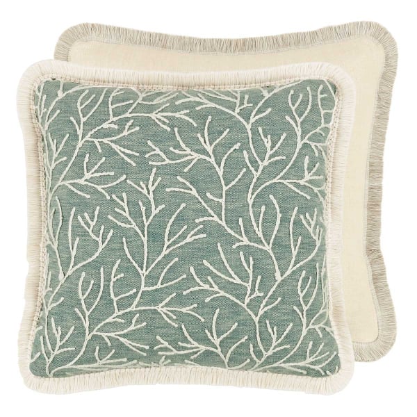 On its front, Cerelia features an undulating and textured floral pattern. Fine stems wind through the decor and draw a light, organic landscape. The back has a plain surface, in contrast to the graphic richness of the front. Villa Nova highlights this composition through a subtle embroidery, framed by a brushed fringe finish.