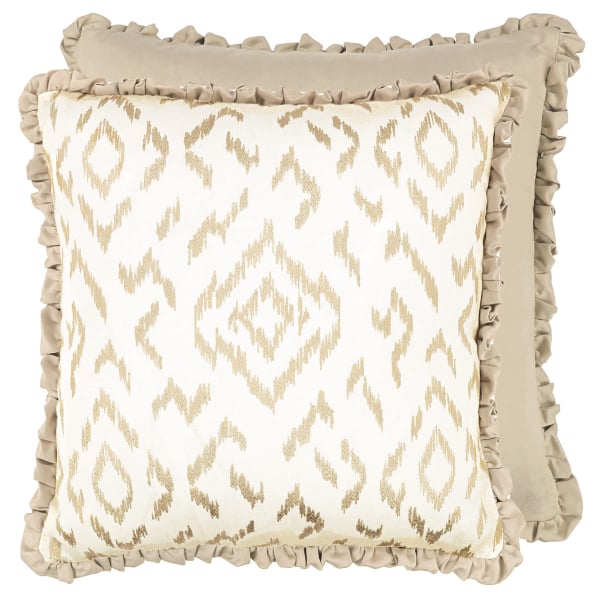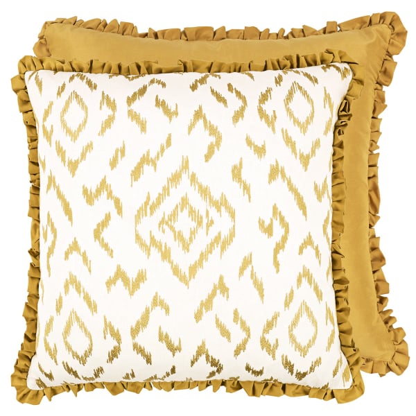Folly is a cushion with a geometric ikat-inspired pattern, made partly of natural cotton. Embroidered with meticulous care, the irregular and discontinuous lines form lively and clear patterns on the front. The reverse has a plain surface, which tempers the graphic expression of the face. A dense ruffle frames the whole and affirms the visual presence of the model signed Villa Nova.