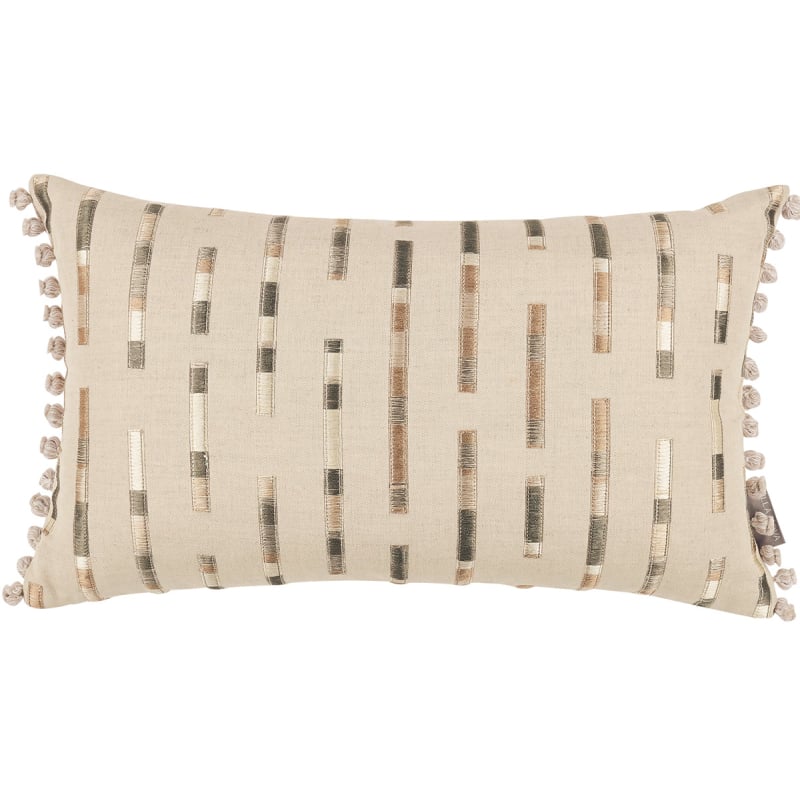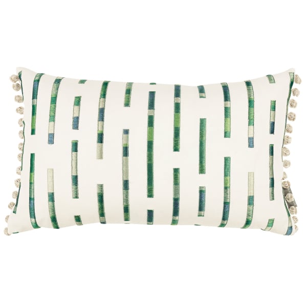 Elwood is a rectangular cushion with a geometric pattern, composed of embroidered vertical lines of irregular lengths. These fragmented stripes, with contrasting shades, establish a graphic rhythm on a partially cotton base. The discreet pompom finish on the sides accentuates the visual charm. Signed Villa Nova, this piece balances structured rigor and textile softness.