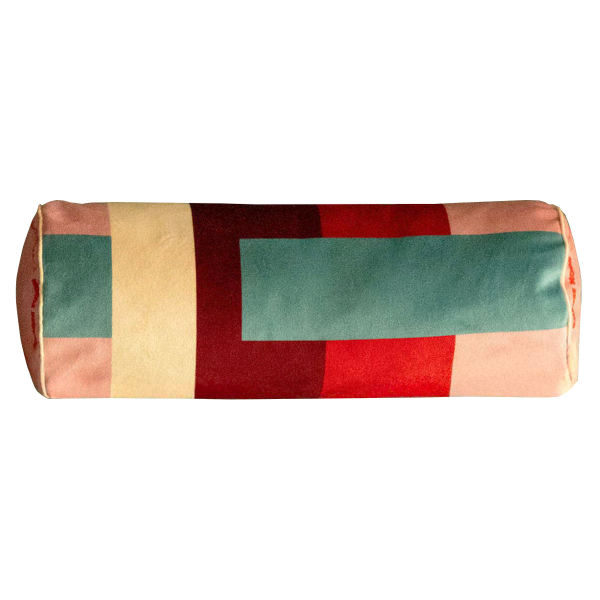 The Room Service bolster is a cylindrical cushion with a geometric pattern by Babel Brune. The figures are organized with graphic rigor, alternating lines and rectangles in a structured composition. The design, inspired by a contemporary pictorial language, gives a strong visual rhythm. Each form dialogues with the other, in an aesthetic that is both lively and measured.