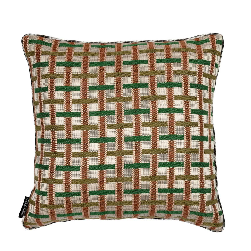 The Ivy cushion from La Maison Casamance features a checkered pattern on one side, composed of structured lines. The lines intersect with precision, creating a graphic pattern with a subtle texture. Its plain reverse side features a understated surface that reveals the tactile richness of the material. Crafted from cotton and linen, this design features a natural texture accentuated by a piping finish.