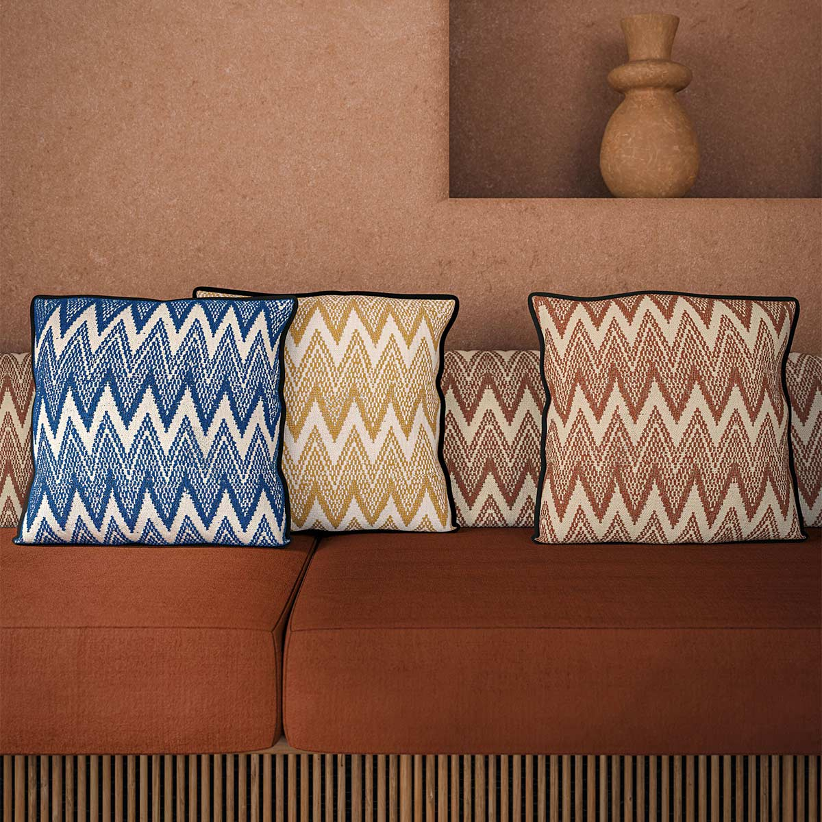 Maison Casamance presents Hozho, a cushion featuring a geometric pattern punctuated by herringbone motifs that unfold in vibrant lines. The pattern, structured by a series of closely spaced, irregular peaks, creates a graphic rhythm. The fabric features a dense texture with a soft feel that accentuates the weave’s texture. A satin stitch finish frames the whole design with a clean, precise line.