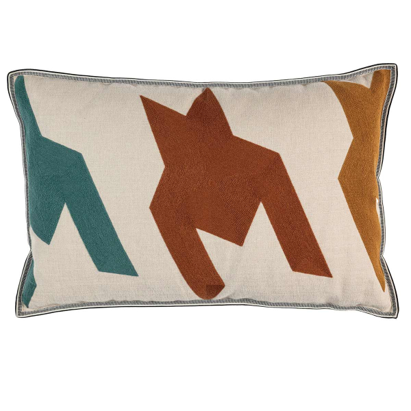 Designed by La Maison Casamance, Triptique is a cushion featuring a geometric pattern that unfolds on the front. Angular shapes structure the composition, while the embroidery creates a graphic, raised text. The plain back combines cotton and linen in a soft fabric that extends the textile presence with sobriety. A subtle braid accentuates the outline, creating a clean, defined silhouette.