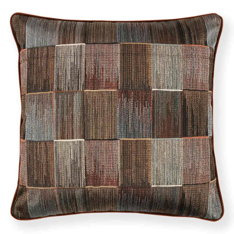 Together with Sekani, Romo has designed a cushion featuring dense embroidery, with a series of rectangles featuring textured lines. The meticulous arrangement of threads creates a vibrant geometric pattern, rich in texture. Cotton predominates in this composition, which plays with light and depth. Each stitch seems to create a rhythm, poised between measured calm and vibrant intensity.
