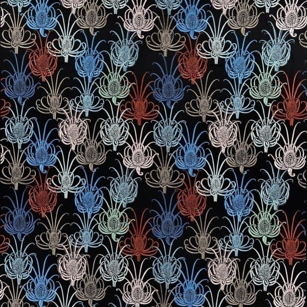 Designed by Christian Lacroix, this fabric is adorned with stunning embroidery of jewel toned thistle motifs on a striking graphite hued, pure satin ground. This unique design drapes beautifully for dazzling curtains.